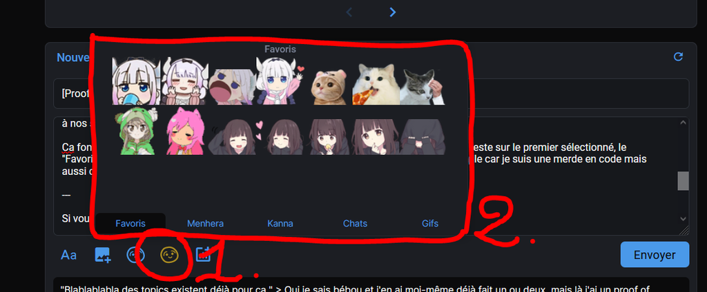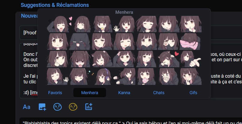Donc l'idée, c'est d'avoir un bouton "stickers" mais dédié à nos favoris et nos stickers persos, où ceux-ci sont triés dans des onglets. On oublie la liste des favoris à la Risibank qui est présentée de manière assez bordélique et on part sur un truc ergonomique et discret.