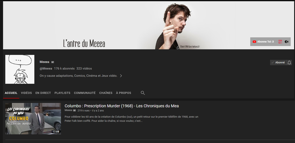 Perso je suis bien abonné depuis 10 ans, et on le voit pas trop il privilégie le contenu a sa gueule, mais un mec qui reste enfermé dans sa chambre a faire des vidéos sur Colombo depuis 2 ans c'était clairement chelou.