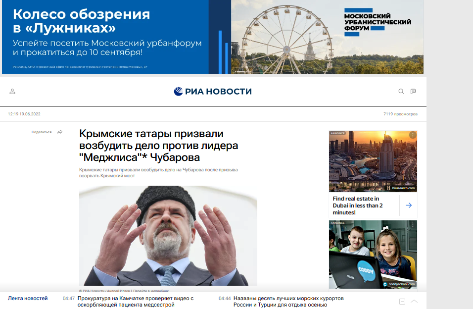 "Чубаров, вторя украинским националистам, публично заявляет о необходимости атаки на Крымский мост. Истерика беглого лидера, прежде всего, обусловлена большими потерями ВСУ в спецоперации и возможными поставками НАТОвских реактивных систем залпового огня. Убедительная просьба, прокуратуру Российской Федерации и следственный комитет, не оставить без внимания экстремистские высказывания Чубарова и возбудить уголовное дело за призыв к разрушению гражданской инфраструктуры", - сказал РИА Новости Умеров.