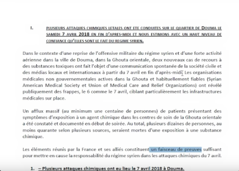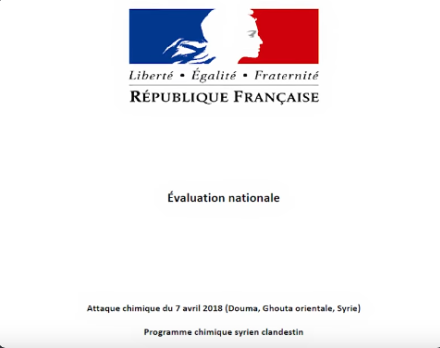 Soit disant il y aurait une attaque commanditée par Bachar Al Assad le 7 avril 2018 à Douma. Il y aurait eu 40 morts. La veille des frappes de la coalition le 12 avril, Macron nous avait assuré qu'il avait toutes les preuves de l'attaque chimique et de l'implication d'Assad. Bizarrement il n'avait pas voulu les montrer là. Il aurait pu transmettre les preuves mais non. Sans doute parce que James Mattis secrétaire à la défense à ce moment là était en train de les chercher. A ce qu'il parait les échantillons fournis par les médecins confirmaient la présence de produits chimiques. Ils ne disent pas quel bord les a utilisé. Finalement la nuit du 13 au 14 avril, la coalition avec les US, la France et le Royaume Uni balance une centaine de missiles sur la Syrie. Et en bon démocrate, Macron a pris la décision tout seul. La population et le parlement, il n'en avait strictement rien à foutre. Sans oublier le viol de la constitution. Sans oublier celui du droit international. Cela en fait une agression illégale. D'autres appellent cela du terrorisme ce qui est factuellement vrai. En bref, il s'agissait de terroriser Bachar pour qu'il ne recommence pas quelque chose qu'il n'avait pas fait et dont on était même pas sûr qu'il l'avait fait. Tant qu'on est soutenu par les néocons, visiblement, on se sent tout de suite investi d'une mission divine permettant de bombarder au nom des droits de l'homme pour un crime qui n'a pas été commis. Au nom des droits de l'homme, de la démocratie, de la liberté ou plutôt des US, d'Israel et de leurs néocons. Il suffit de dire que douter c'est la même chose que nier la Shoah est certains faibles d'esprit se couchent comme des lâches et de soumis. Le 14 avril, après la déclaration de Macron le 13, des preuves nous seront révélés dans une évaluation nationale.