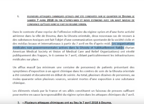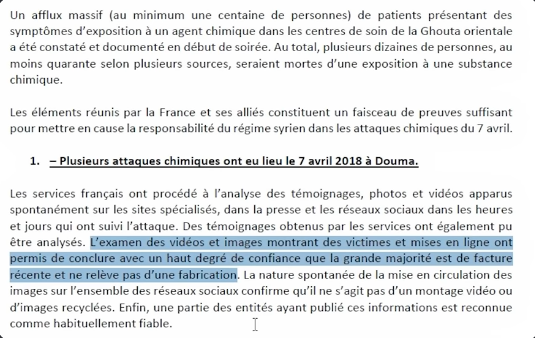 Sauf que ce document était moins affirmatif que Macron. Dès que ça parle de l'attaque chimique, de la nature des produits utilisés et de l'implication de l'armée syrienne, l'utilisation se fait avant tout au conditionnel. On nous parle de faisceau de preuves fournis par des ONG soit disant habituellement fiables, dont on peut conclure avec un haut niveau, pas de certitudes, que la majorité ( pas la totalité ) est de facture récente. Récente, on ne sait pas trop ce que ça veut dire ici, quelques jours, une semaine, un mois, on n'en savait rien. Et le rapport ne révèle pas de fabrication. Je cite " Nous estimons avec un haut niveau de confiance qu'elles sont le fait du régime syrien car il n'existe pas d'autre scénario plausible que celui d'une action des forces armées syriennes. " En gros la logique c'est que c'est lui parce que ça ne peut être personne d'autre, soit disant. Le tout sur la foi de vidéos postés sur les réseaux sociaux. On ne sait pas qui a fait ça ni quels produits ont été utilisés mais ce serait forcément Bachar le coupable. Drôle de manière de procéder n'est ce pas? L'avantage de ce genre d'explications, c'est qu'on peut l'utiliser pour raconter tout et n'importe quoi, pour prouver tout et n'importe quoi.