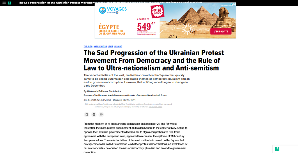 Oleksandr Feldman, dans un article intitulé : The Sad Progression of the Ukrainian Protest Movement From Democracy and the Rule of Law to Ultra-nationalism and Anti-semitism.