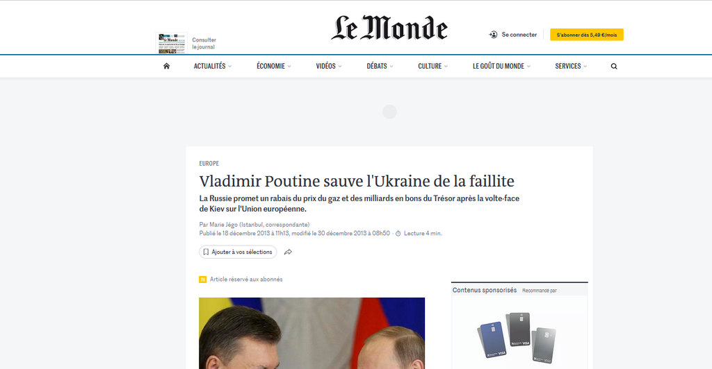 La Russie devait investir 15 Md$ dans des titres du gouvernement ukrainien et réduire d’un tiers le tarif de ses livraisons de gaz à l’Ukraine, soit 5 Md$ de plus. Vladimir Poutine a malicieusement fait savoir que les 15 Md$ investis ne sont « liés à aucune condition, ni à une hausse, ni à une baisse, ni au gel des avantages sociaux, des retraites, des bourses ou des dépenses » – une allusion aux conditions imposées par le FMI.
