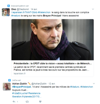 Malgré les mortiers, armes à feu, grenades ou cocktails Molotov utilisés par les manifestants « pacifiques » (sans oublier les mannequins de chavistes pendus aux ponts, signature du paramilitarisme colombien), la loi interdit à la Police ou la Garde Nationale d’user de leurs armes à feu. Les manifestants de droite en profitent pour pousser leur avantage, déverser leur racisme sur les gardes ou policiers, les provoquer à coups de jets d’urine, d’excréments et de tirs à balles réelles, guettant la réaction pour les caméras de CNN. Les fonctionnaires des forces de l’ordre qui ont désobéi et qui se sont rendus coupables de blessures ou de morts de manifestants ont été arrêtés et poursuivis en justice [10]. Le fait est que la grande majorité des victimes sont des travailleurs qui allaient au boulot ou en revenaient, des militants chavistes ou des membres des forces de l’ordre [11]. C’est pourquoi Le Monde parle de morts en général – pour que l’on croie qu’il s’agit de « morts du régime ». Allonger la liste des « morts » sert à augmenter l’appui planétaire a la déstabilisation : il y a dans ces meurtres, il est terrible de le constater, un effet de commande médiatique.