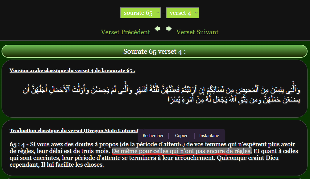 65 : 4 - Si vous avez des doutes à propos (de la période d'attente) de vos femmes qui n'espèrent plus avoir de règles, leur délai est de trois mois. De même pour celles qui n'ont pas encore de règles. Et quant à celles qui sont enceintes, leur période d'attente se terminera à leur accouchement. Quiconque craint Dieu cependant, Il lui facilite les choses.