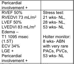 tu regardes "pericardical involvement +" = atteinte péricardite toujours en cours et tu as le nombre de semaines où les tests ont été effectués donc au moins 24 weeks (24 semaines = 6 mois).