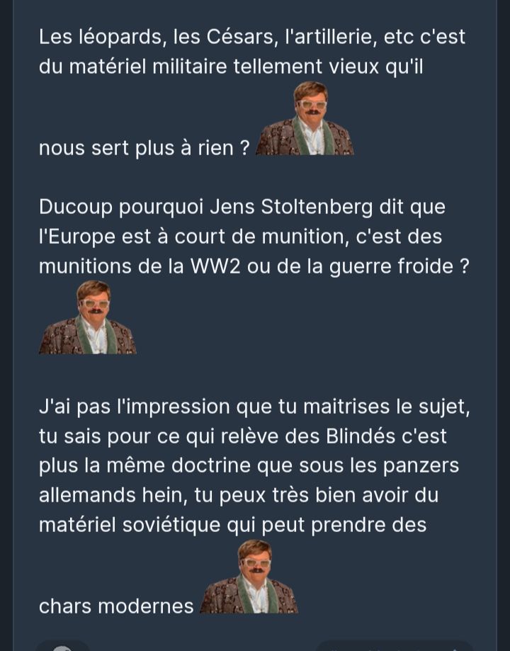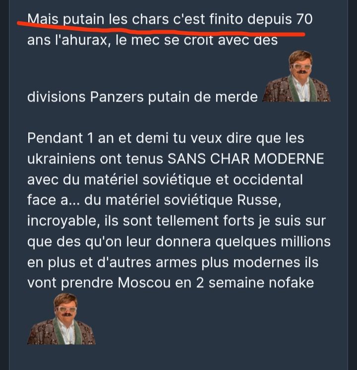 " Depuis 2 pages tu nous soule avec " mais l'Allemagne a fourni des chars léopard à l'Ukraine donc ils sont bien équipé " ( alors qu'ils ont reçu le premier chars léopard il y a deux mois et qu'avant les Ukrainiens utilisé des chars de merde de 1960 ) et la tu changes littéralement d'avis parce que tu te rend compte que tu a complètement tort