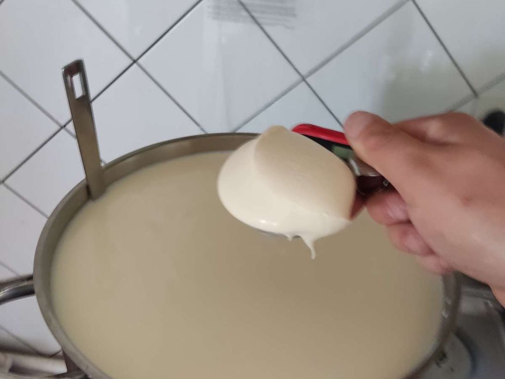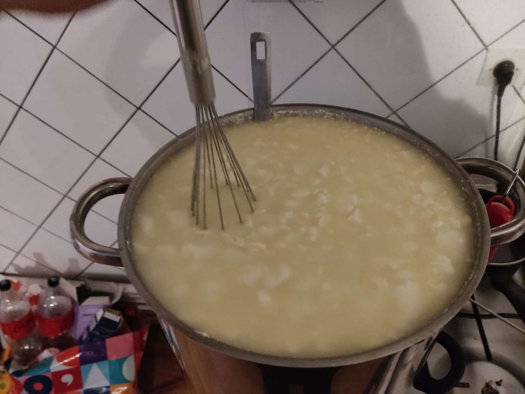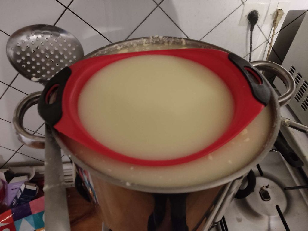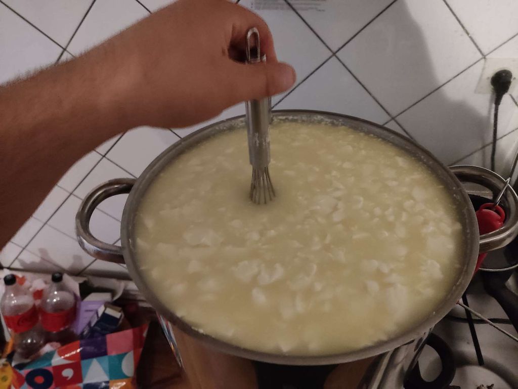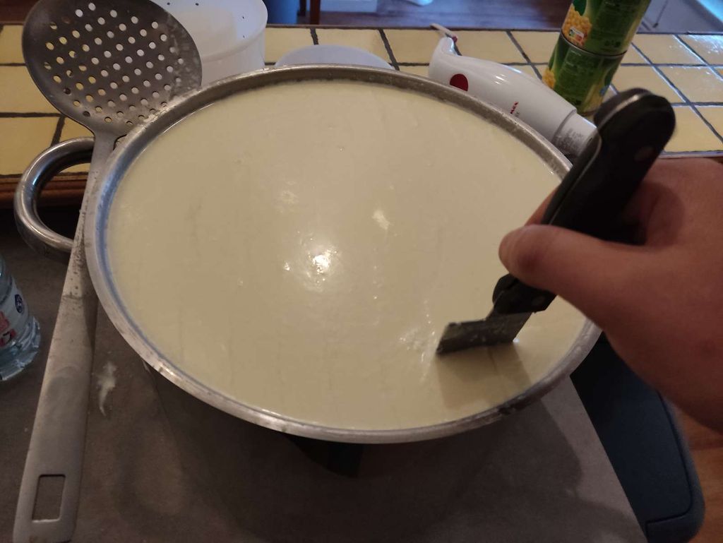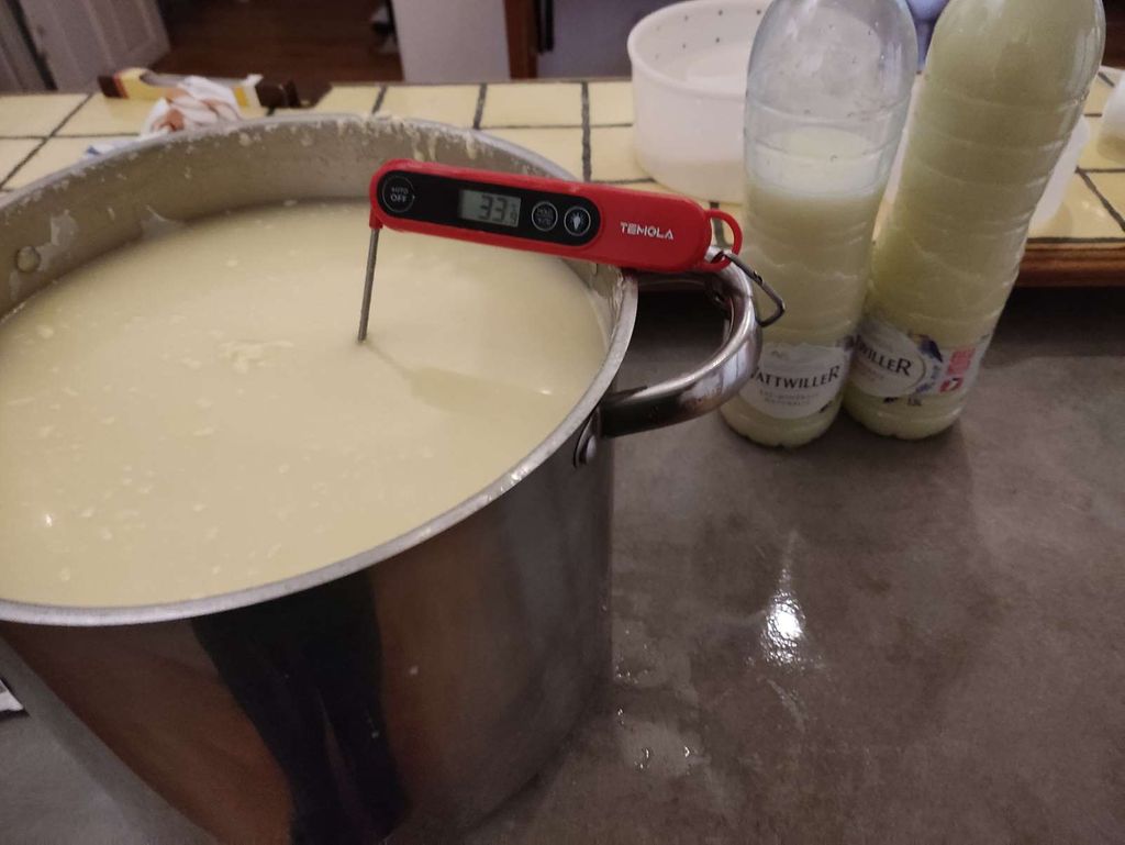 On chauffe le lait à 32°C en mode bain-marie comme pour n'importe quel fromage afin d'éviter que ça crame dans le fond. (Comme un con j'ai été me griller une clope et c'est monté à 34°C, en vrai c'est visiblement pas un drame, pareil évitez et pensez à surveiller.
