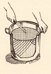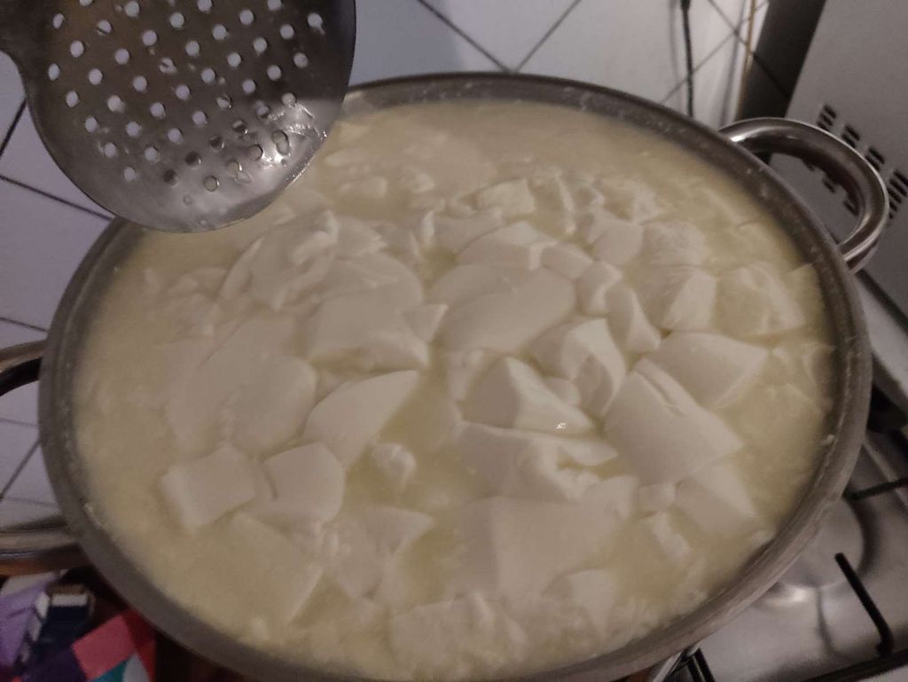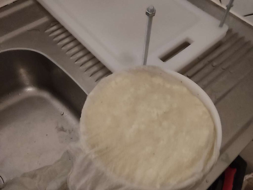 On retire donc 15-20% du contenu de la casserole en petit lait, perso j'ai viré 2,5L. Pour faire ça le plus simple c'est de foutre une passoire dans le chaudron et de venir récupérer avec un verre le petit lait, comme ça on évite de prendre en même temps des bouts de fromage. (Oubliez pas de la stériliser au préalable. Perso vu que c'est en plastoc : vinaigre blanchisée.)