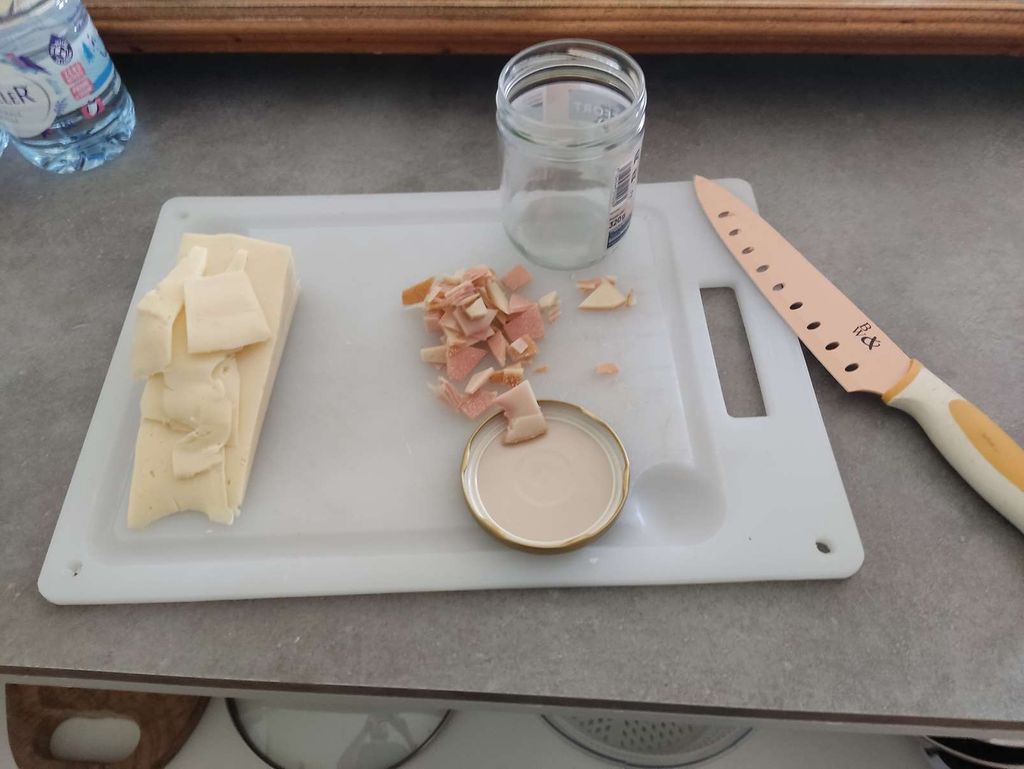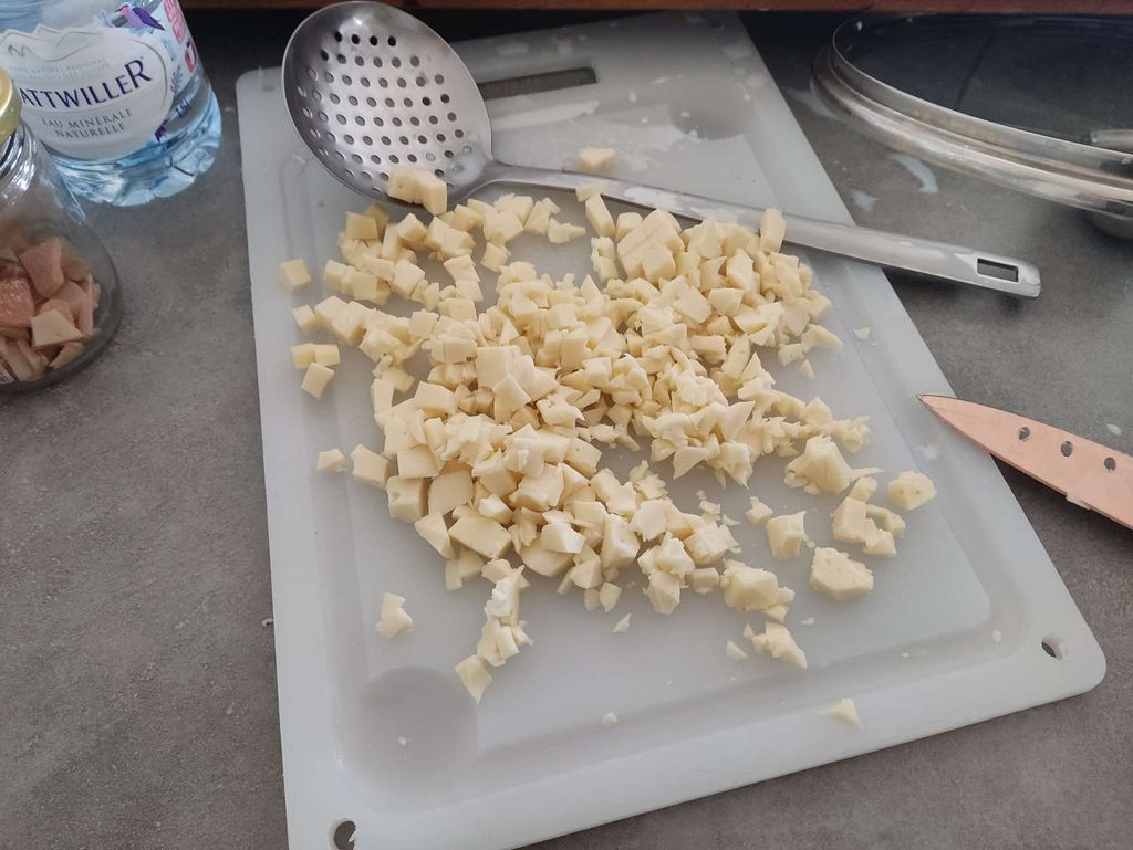 On retire la croute de la raclette et on la met de côté (gardez là on la réutilisera à la fin), le reste on le coupe en tout petits morceaux (voir même si vous avez le courage, vous pouvez le raper.) et on l'ajoute à la gamelle de lait, on touille un bon coup et on patiente une heure le temps que ça infuse et se disolve.
