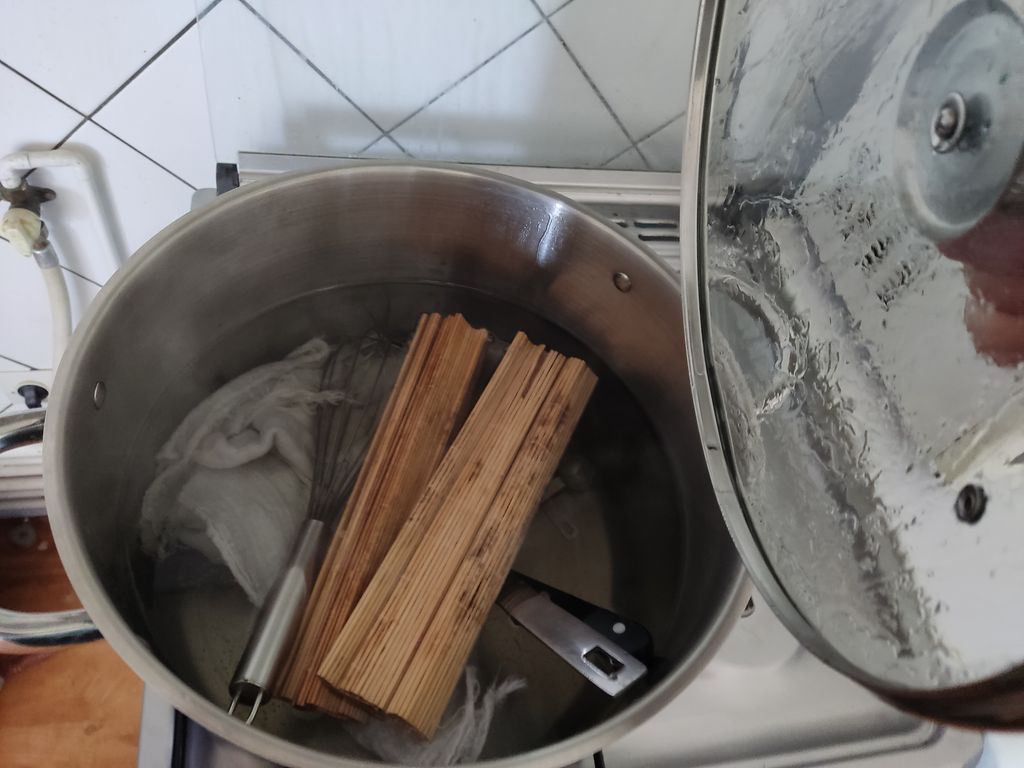 Bon, comme la dernière fois et comme à chaque fois qu'on prépare un truc à bouffer qui doit se conserver un peu de temps : On nettoie tout, on stérilise tout en faisant bouillir les instruments et en aspergeant allègrement de vinaigre blanc ce qui ne peut pas l'être (exemple : vos mains.