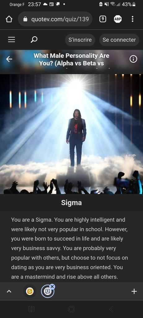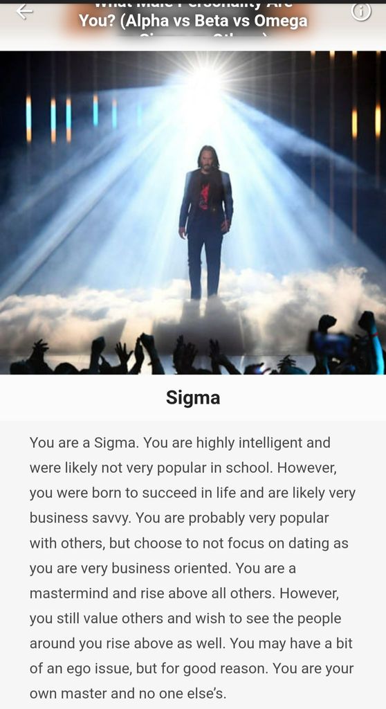 "Vous êtes un Gamma. Vous êtes très introverti et une âme sensible. Vous n’aimez pas l’attention des autres et vous restez souvent seul. Vous avez beaucoup de rêves, mais vous manquez de confiance pour les réaliser. Vous êtes un peu influençable, mais vous voulez devenir plus fort. Vous admirez les hommes sigma et espérez le devenir, mais il est peu probable que vous y parveniez. Vous passez probablement beaucoup de temps en ligne pour éviter votre triste quotidien."