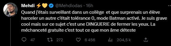 nan mais pour le coup les arabes sont très représentatif dans le harcèlement scolaire, mais dans les commentaires beaucoup d'arabes condamne, je me rappel qu'au collège quand je me faisais tabasser à 10 vs 1, y'avait toujours un arabe qui essayait de me défendre, donc bon moi je ferais pas d'amalgame