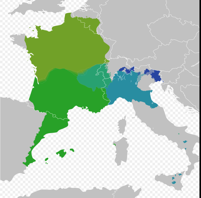 + la Catalogne (Le Catalan étant aussi une langue de la famille Gallo-Romaine)
