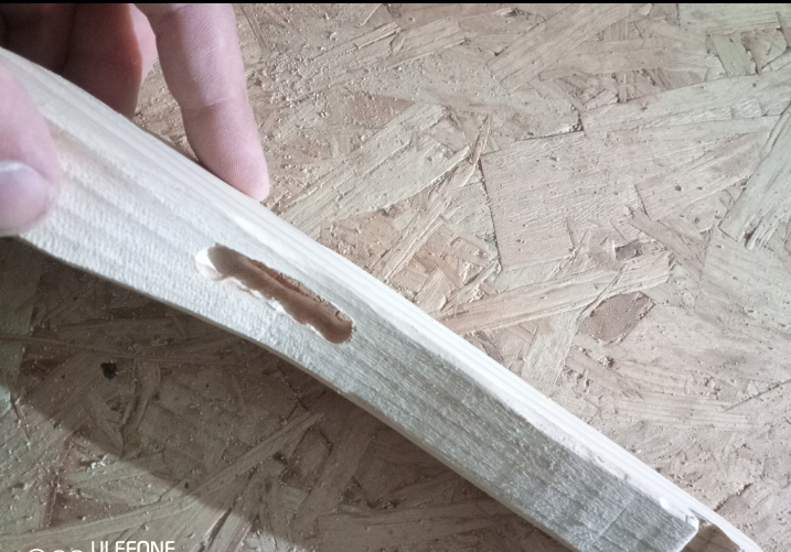 On percé deux trois aux extrémités pour fixer un élastique, et un trou au centre pour le fixer au manche.