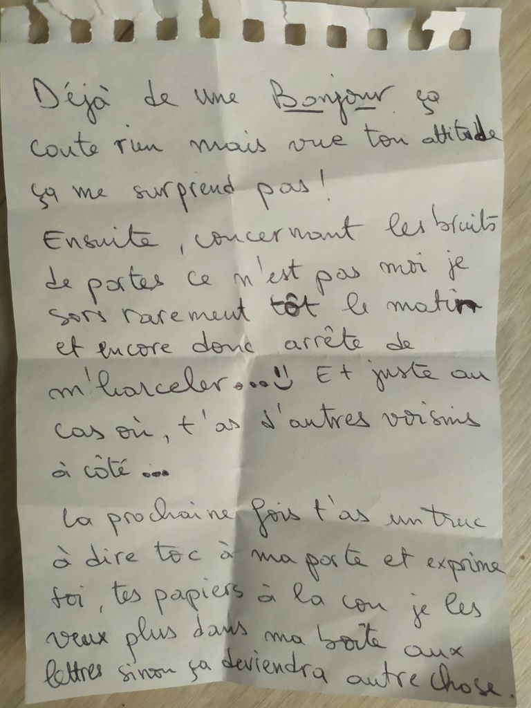 Elle me laisse cette lettre sous ma porte ,elle pense que c'est du harcèlement