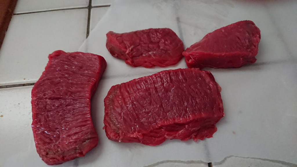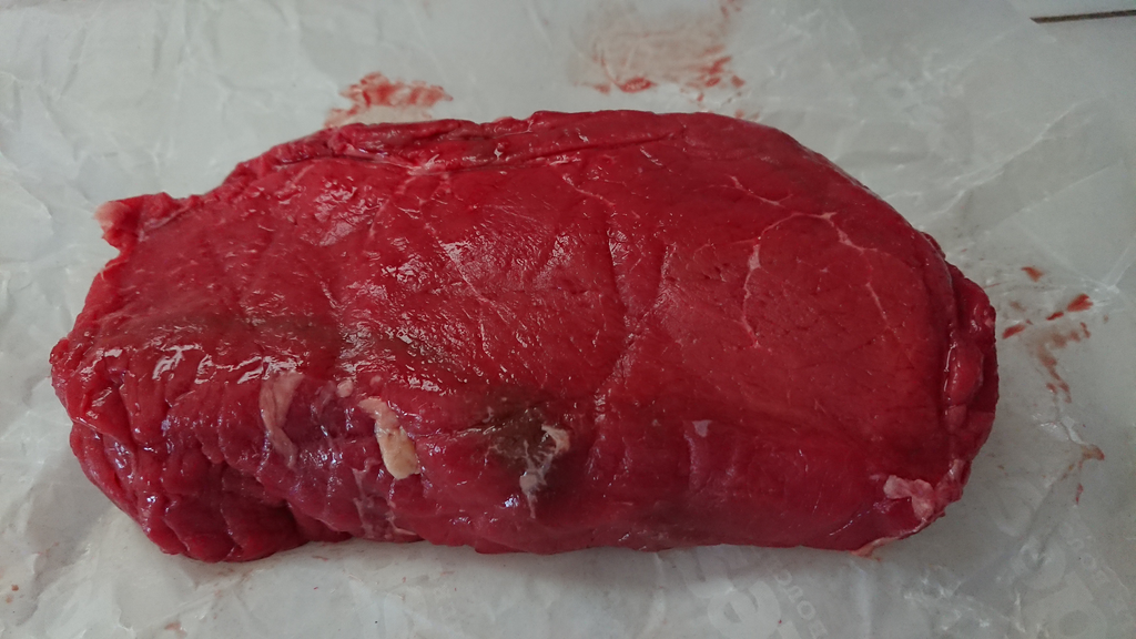 - Viande : Un bon gros pavé de Rumsteck des familles, on prend de quoi faire 2 gros steaks (le reste va être congelé)