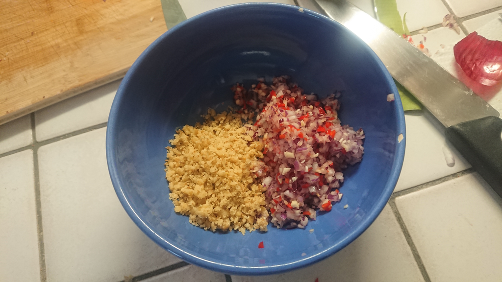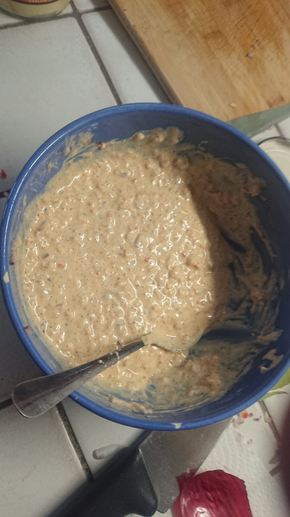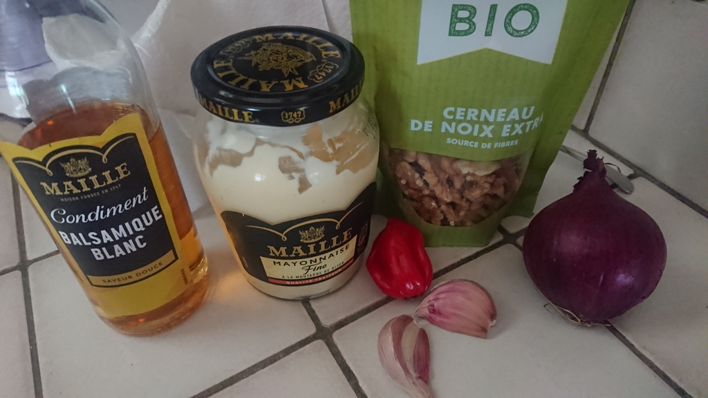 - Sauce : ~6 Cerneau de noix concassé, 1 piment fort, 1 oignon, 2 gousses d'ail, vinaigre balsamique blanc, mayonnaise