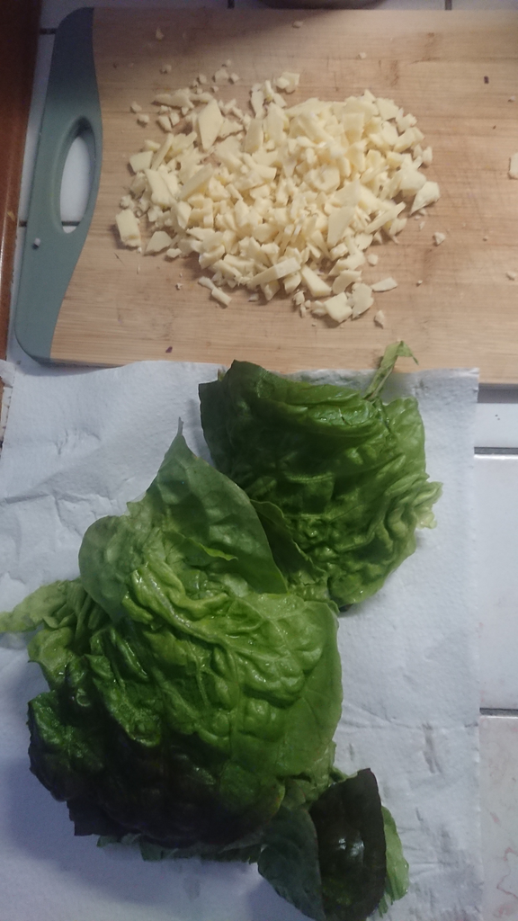 - Cheddar hachée grossièrement et salade: Pour le cheddar je prend habituellement du cheddar fermier mais il y en avait pas donc c'est du cheddar de marque basique