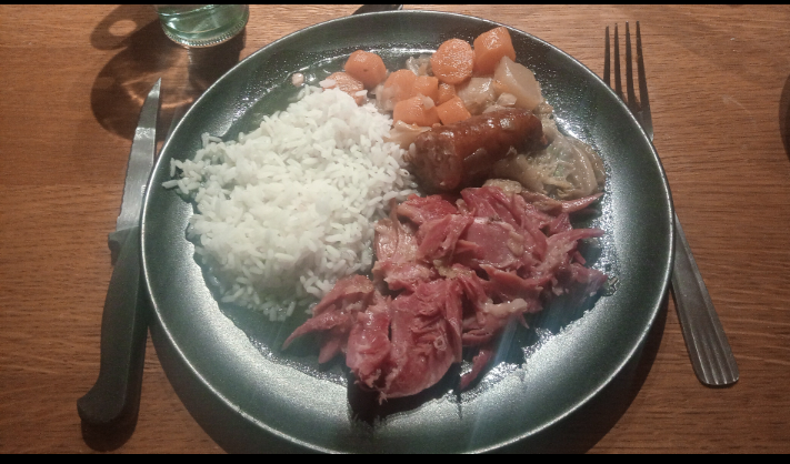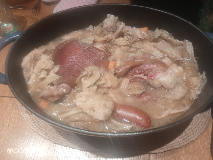 Soupe poireaux patates saucisse et tranches de doubeurre au four.
