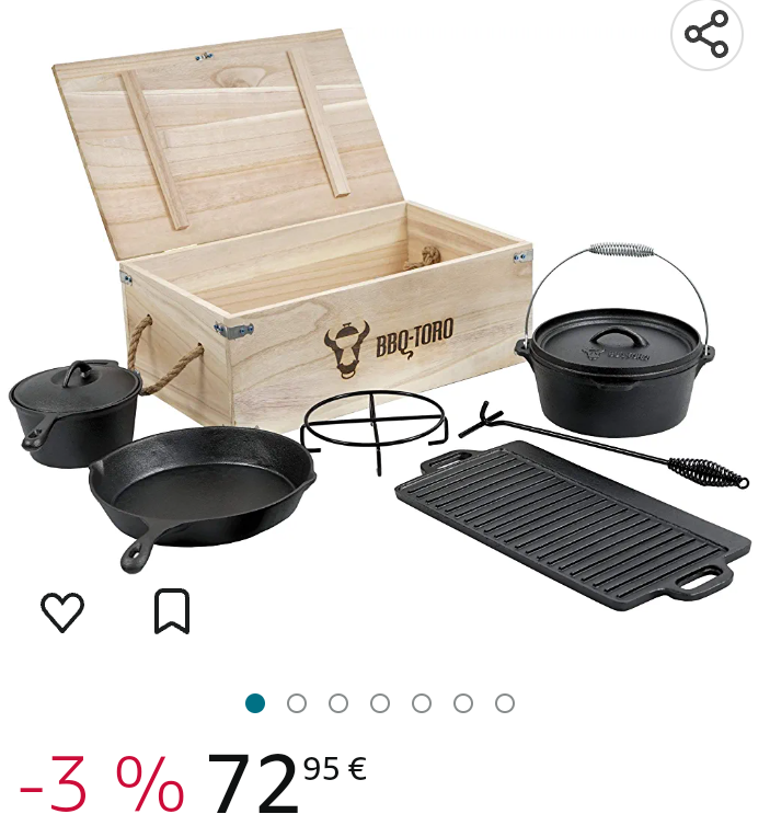 BBQ-TORO Set de Dutch Oven et boîte en Bois | en Fonte, déjà brûlée (7 pièces)
