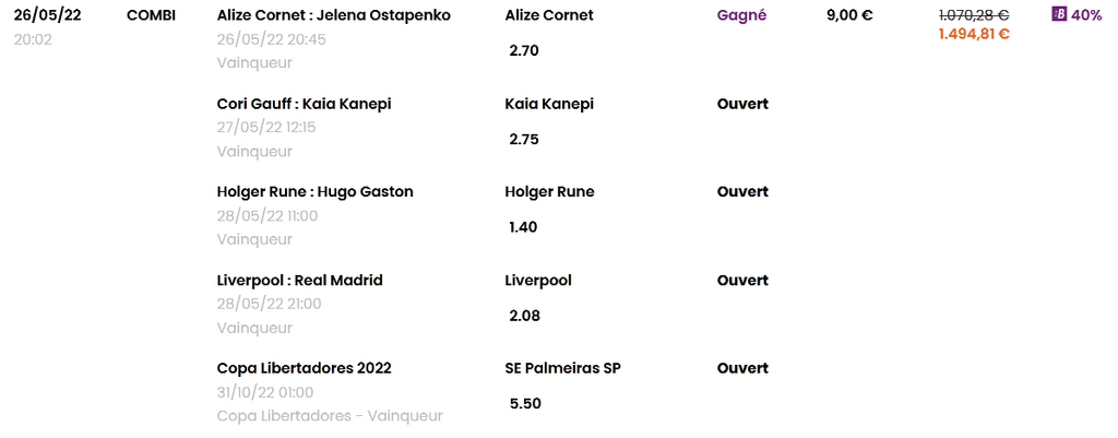 Je sais plus, j'en ai perdu plein et gagné plein, si tu veux savoir depuis que je parie c'est à dire vers 2009 je suis sûrement en perte sèche sur tous les bookmakers, mais depuis début 2021 quand j'ai repris avec une stratégie élaborée je suis en bénef'
