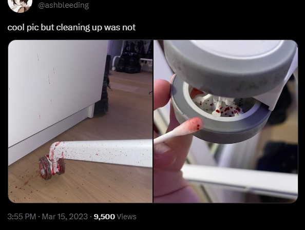 Comme la fois où il a dû utiliser des cotons tiges pour enlever des éclats de sang qui s'étaient coincé dans la roulette de sa chaise haha , ça ne vous le fait jamais ?