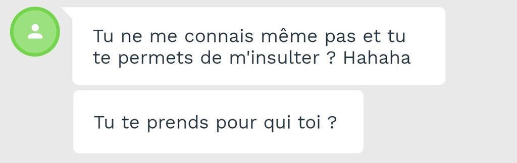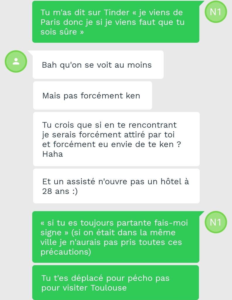 Il n'a qu'une chose en tête et le fait clairement comprendre mais dès qu'il apprend que c'était un foutage de gueule « Nooooon je n'avais pas en tête l'idée de te tringler je suis un innocent touriste de la ville rose haha j'ai tou-toujours rêvé de visiter Toulouse
