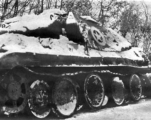 photo d'un char Allemand déguisé en un char Américain durant la Bataille des Ardennes, décembre 1944