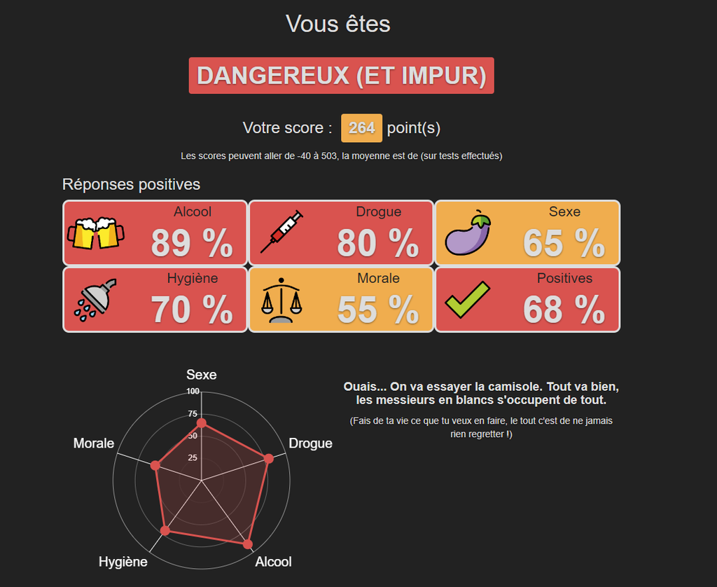 Je l’ai plus flemme de le refaire mais je suis considéré par le test comme un putain de dégénéré