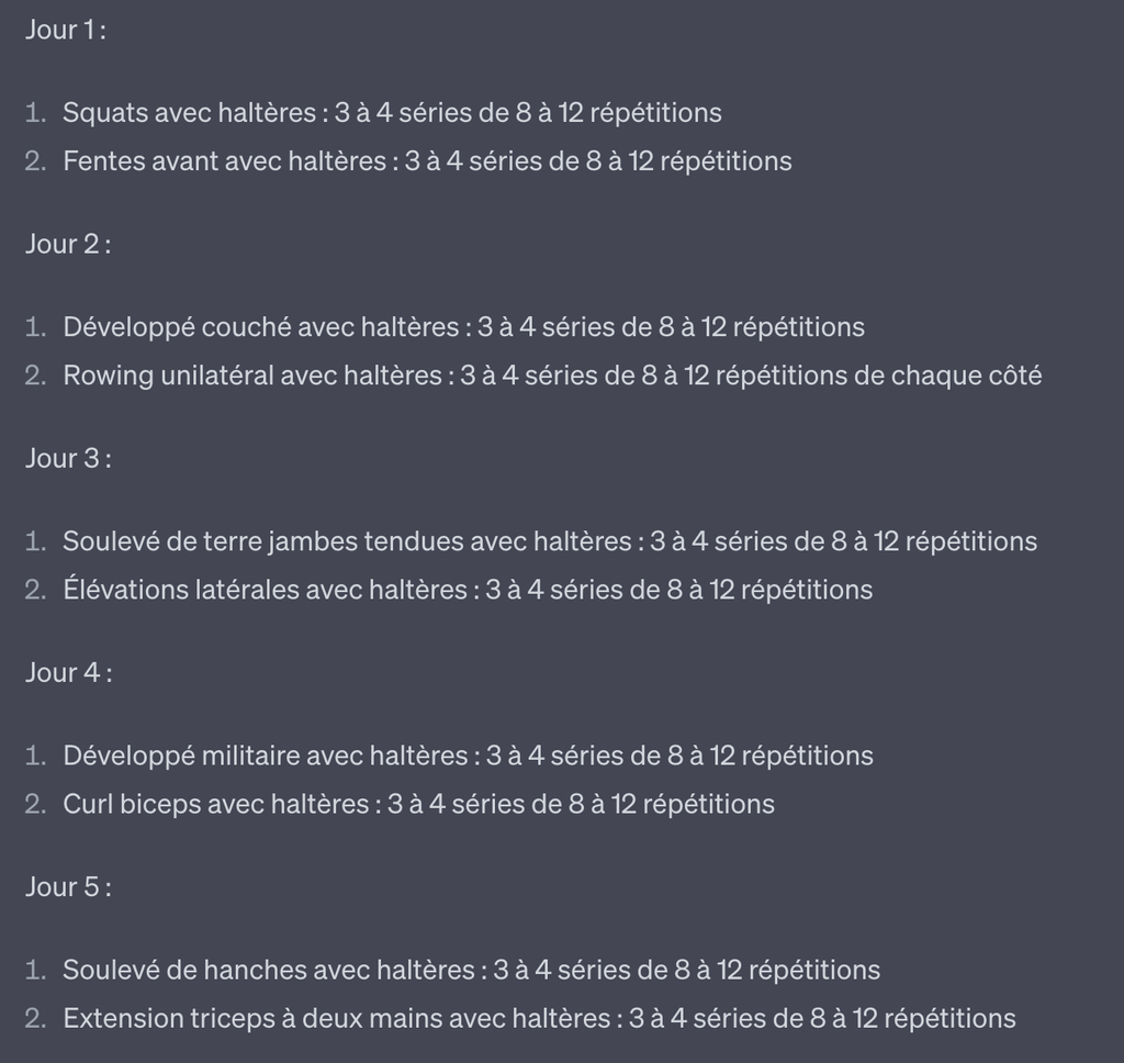 Ahiii non c'est pourri khey. Demande lui un ppl ou un programme en 4 jours. Là y'a aucune intensité, tes séances dure 20 minutes ça bosse rien