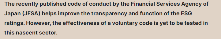 "Le code de conduite récemment publié par l'Agence des services financiers du Japon (JFSA) contribue à améliorer la transparence et la fonction des notations ESG. Toutefois, l'efficacité d'un code volontaire doit encore être testée dans ce secteur naissant."