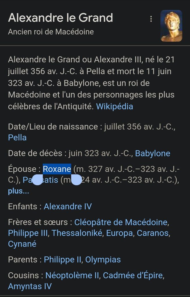De même que la première fille que j'ai embrassé s'appelait Roxane comme la première épouse de Alexandre le Grand.