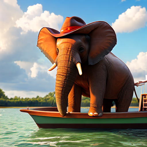 (hyperrealism)1.2,elephant standing on a boat wearing a fisher's hat.(8K UHD)1.2, (photorealistic)1.2,