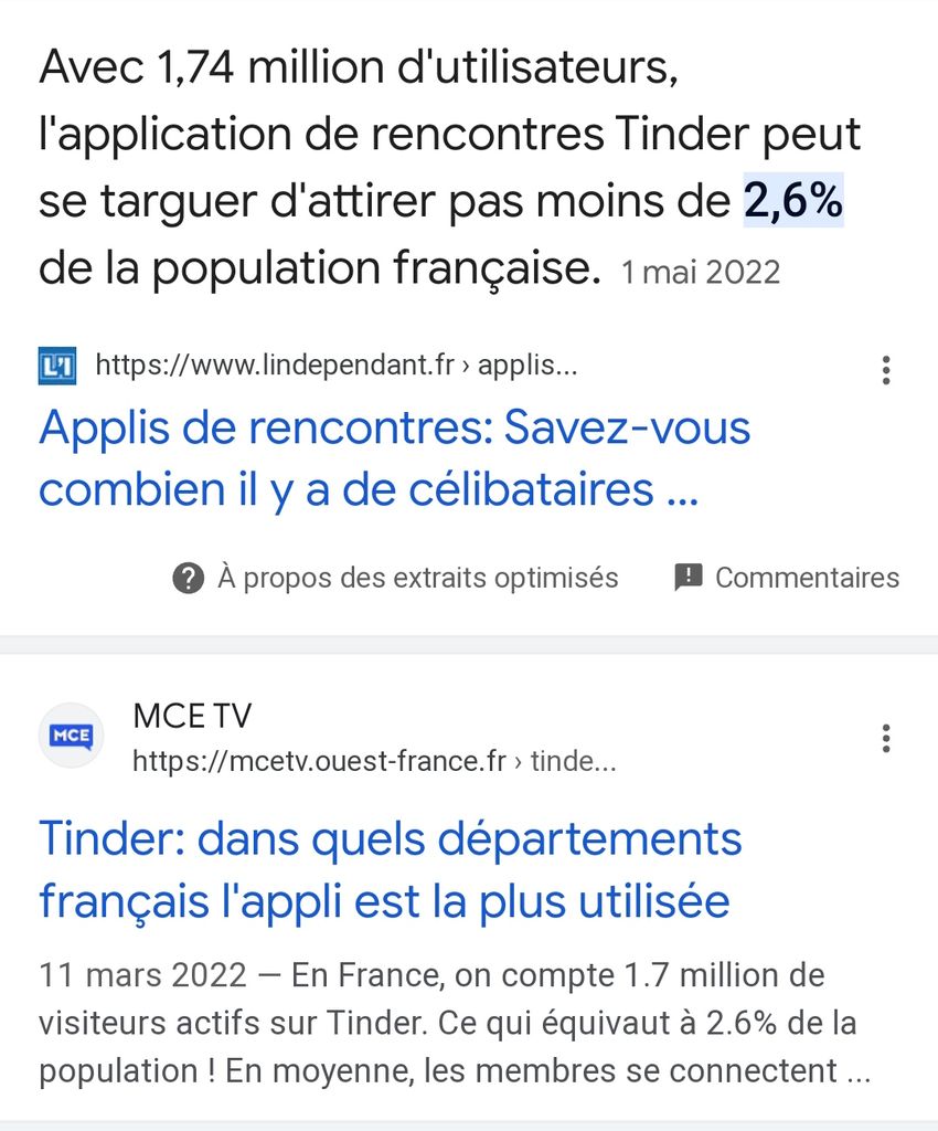 C'est fascinant comment les golems ont totalement intégré qu'il n'existe que Tinder dans leur vie de PNJ pour rencontrer des meufs, alors que ça représente 2,6% des gens.
