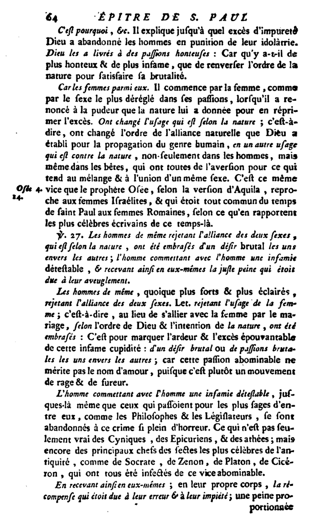 26 Les hommes de même, rejetant l’alliance des deux sexes, qui est selon la nature. ont été embrasés d’un désir brutal les uns envers les autres, l’homme commettant avec l’homme une infamie détestable, et recevant ainsi en eux-mêmes la juste peine qui était due à leur égarement.