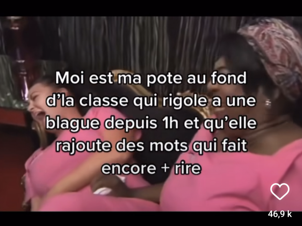 "Lorsque ma pote dit quelque chose d'hilarant alors que nous étions déjà en train de rire à cause d'une blague depuis 1 heure au fond de la classe."