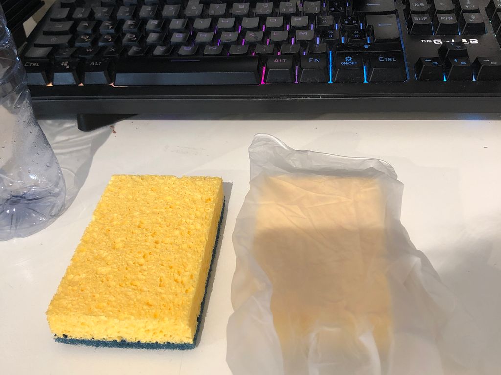 1) Munissez vous de vos deux éponges, et placez les coté vert (qui gratte) vers la table, donc côté mousse vers vous.