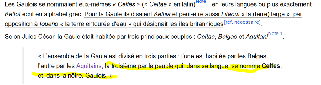 Dans le paragraphe, il explique justement qu'il y a trois grands peuples (selon lui) dans les différentes Gaules, Aquitains, Belges et GAULOIS, encore une fois selon la dénomination romaine, Gaulois = celte de la Gallia Celtica et c'est tout, c'est fou à quel point t'es dans le déni mon khey