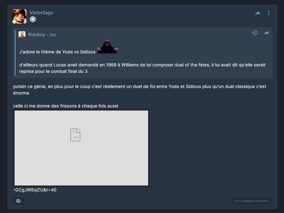 putain ce génie, en plus pour le coup c'est réellement un duel de foi entre Yoda et Sidious plus qu'un duel classique c'est énorme