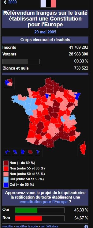 Il s'agit du troisième référendum sur un traité européen, après ceux de 1972 et de 1992, mais c'est le premier à être rejeté : en effet, le « non » recueille 54,68 % des suffrages exprimés, soit 2 641 238 voix de plus que le « oui ».