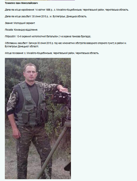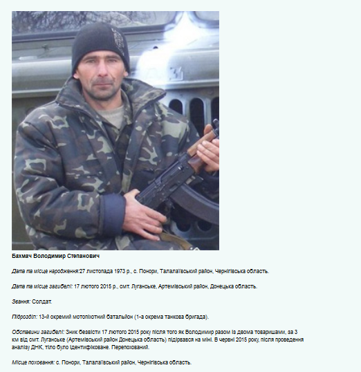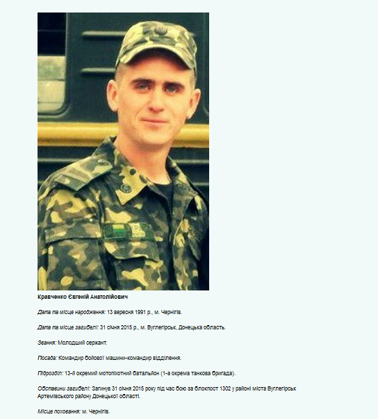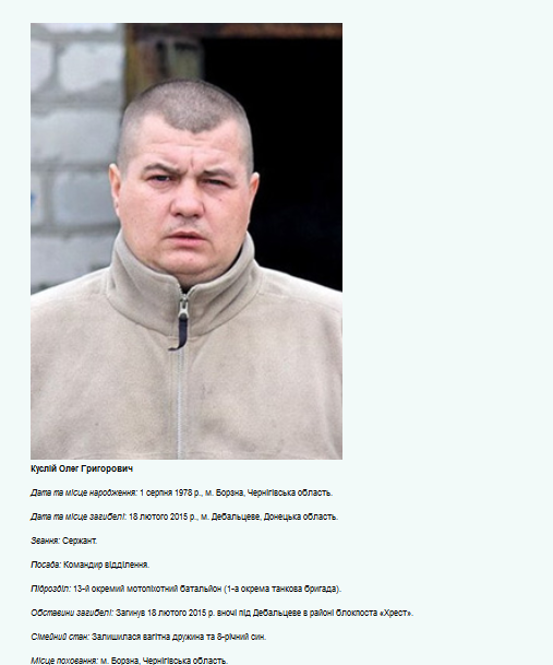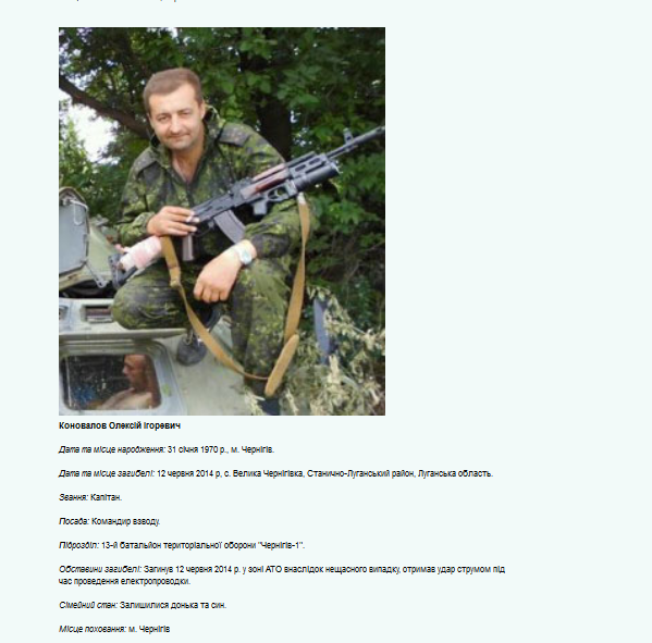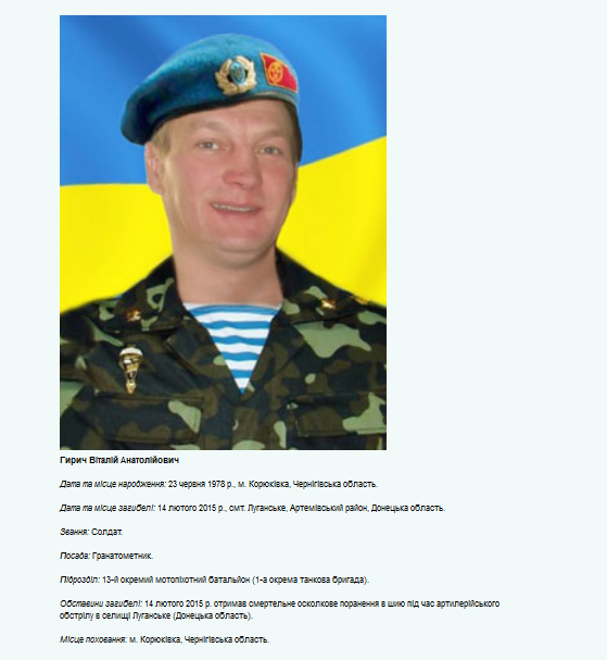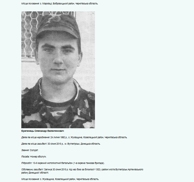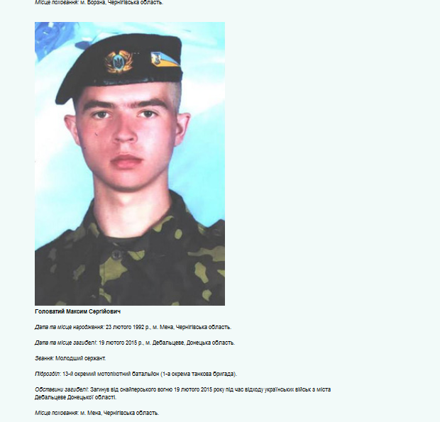 Volodymyr Blizniouk (1988-2014), originaire de Tchernigov, conscrit dans la Garde nationale, simple employé, il étudia à l’université dans l’Institut ukrainien-russe en partie financé par la Russie. La propagande le lança dans la Révolution du Maïdan (2014), il abandonna là ses études, s’enrôla dans le bataillon Tchernigov-1, en même temps que son père, ancien lieutenant-colonel à la retraite. Ce dernier fut refusé pour cause d’âge. Il fut tué dans le Donbass le 6 septembre 2014. Une plaque commémorative fut installée dans son école secondaire.
