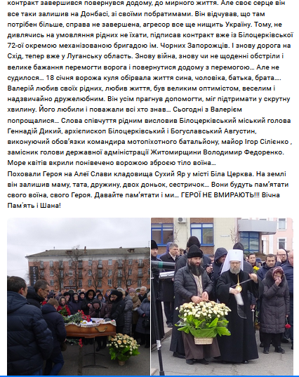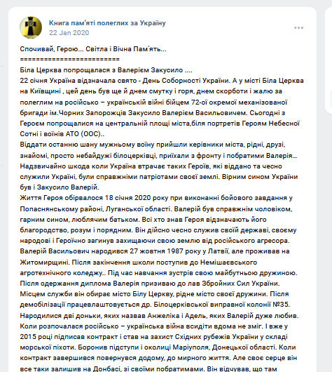 Valery Zakoussilo (1987-2020), il naquit en Lettonie, puis vînt s’installer avec sa famille dans la région de Jytomyr, puis dans la ville de Bila Tserkva, près de Kiev. Il fit des études professionnelles dans un lycée agricole, où il rencontra son épouse. Il effectua son service militaire dans l’armée ukrainienne (vers 2007-2009), puis travailla comme maton dans une colonie pénitentiaire (2009-2015). Il s’enrôla volontairement dans l’armée ukrainienne (2015), pour l’aventure, et certainement contaminé par la propagande, ou attiré par les salaires. Il servit un moment dans les troupes d’infanterie de marine, à Marioupol (36e brigade), termina son contrat et rentra chez lui. Malgré l’opposition de ses proches, il signa un nouveau contrat, n’ayant pas pu rester en place, versé dans le bataillon Kiev, 72e brigade mécanisée. Il fut tué par une balle républicaine, le 18 janvier 2020, dans la région de Popasnaya, lors d’une mission de combat. Il laissait une veuve et deux filles.