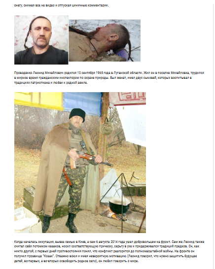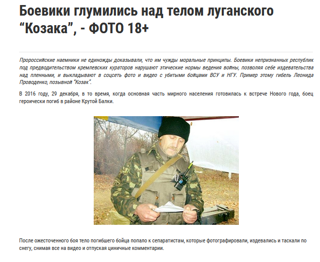 Leonid Provodenko dit Cosaque (1965-2016), transfuge originaire de la région de Lougansk, il fit des études supérieures et entra dans la fonction publique, inspecteur pour la protection de l’environnement, comme forestier. Pour des raisons idéologiques, il soutînt le Maïdan, membre d’une association cosaque dans la tradition de Mazepa (qui trahit les Cosaques et rallia le roi Charles XII de Suède contre la Russie, ce dernier ayant été écrasé à Poltava en Ukraine, Mazepa fut massacré par ses propres hommes (1709). Il poussait le vice, jusqu’à porter la coiffure historique et traditionnelle des cosaques du XVIIe et XVIIIe siècle. Logiquement hostile à la Russie et virant russophobe, il ne soutînt pas l’insurrection, attendit vainement que les bataillons de représailles massacrent les insurgés, puis prit la fuite avec sa famille dans la région de Kiev (juillet 2014). Il se décida même à prendre les armes, en s’enrôlant volontairement dans le bataillon de représailles Kiev (6 août), et fut envoyé au front. Il participa à de nombreuses batailles, et se trouvait en position dans la région de Yassinovataya, non loin de Donetsk. Un assaut au corps à corps, chose rare eut lieue, où il fut tué le 29 décembre 2016. Son unité de reconnaissance fut vaincue et prit la fuite. En rentrant les survivants affirmèrent qu’il aurait poignardé deux ennemis. Il tenta lui-même de couvrir la retraite, avec une mitrailleuse, fut blessé à la tête, puis tué. Son corps fut abandonné par les Ukrainiens, et après des tractations, rendu à l’Ukraine. Une opération de propagande fut montée sur sa mort, indiquant qu’il aurait été « torturé » (mort !), mais aussi que son corps aurait été profané, déclaration mensongère, il fut même dit, dans le culte sinistre des morts par Youri Boutoussov : « il a combattu comme un Cosaque, a vécu comme un Cosaque, et est mort comme un vrai Cosaque, un chevalier ukrainien moderne ». L’affaire ne fit guère illusion, l’idée était aussi d’essayer de convaincre l’opinion internationale (ce fut un autre bide). Il fut enterré à Kiev, dans une tentative d’attirer des foules lors de la cérémonie, dans le plus pur style du culte sinistre des morts et « héros » d’Ukraine (3 janvier 2017). La mèche fit long feu, il fut tout de même médaillé à titre posthume par le Président Porochenko, qui n’osa pas le titrer « Héros de l’Ukraine ». A ma connaissance, ce fut la première fois, dans des poèmes bandéristes, que l’on parla d’orcs en comparaison raciste et déshumanisante des Russes. Il laissait une veuve et deux fils, et ne fut médaillé à titre posthume que très tardivement, car il restait malgré tout, un « Russe du Donbass », un sous-citoyen (22 mai).