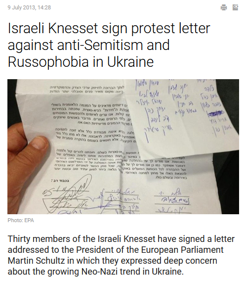 Un quart des députés de la Knesset (Parlement israélien comportant au total 120 députés) avait même alerté le Président du Parlement européen sur le parti néo-nazi Svoboda. Source :
