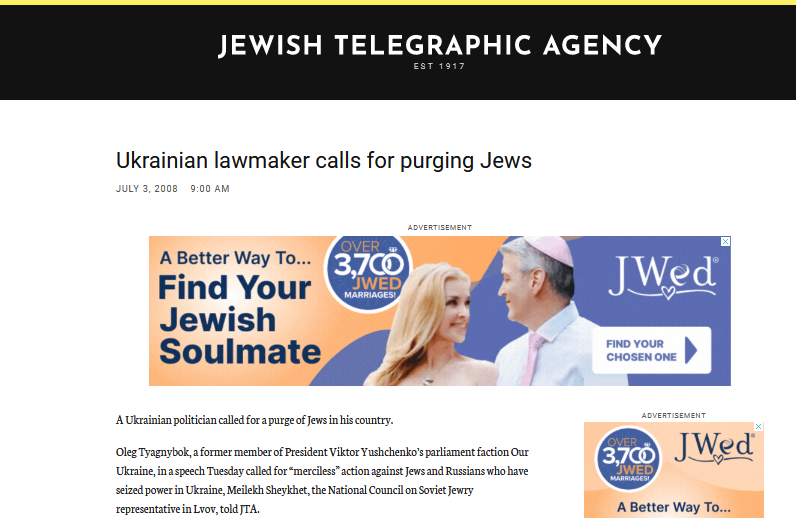 https://www.jta.org/2008/[...]er-calls-for-purging-jews Cet article montre également la manière dont il a appelé à une purge en 2008. " Oleg Tyagnybok, a former member of President Viktor Yushchenko’s parliament faction Our Ukraine, in a speech Tuesday called for “merciless” action against Jews and Russians who have seized power in Ukraine, Meilekh Sheykhet, the National Council on Soviet Jewry representative in Lvov, told JTA".