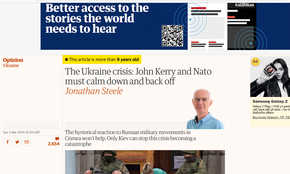 Jonathan Steele du Guardian avait à l'époque également écrit un article pour prévenir et dénoncer l'administration de Obama ainsi que l'OTAN pour avoir provoquer la crise. Le titre est : The Ukraine crisis: John Kerry and Nato must calm down and back off. Source :