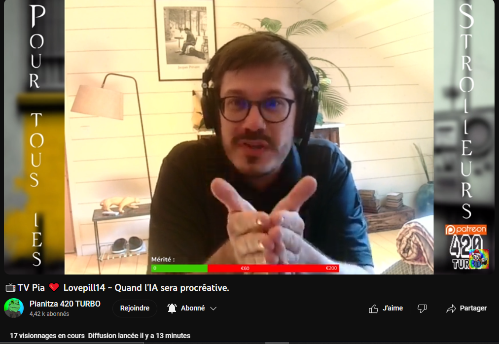 je regarde souvent ses lives aussi mais depuis qu'il va faire sur les videos des magalax avec caddie je l'aime moins, j'aime chez lui sa volonté de vouloir etre artiste d'essayer de faire des videos qui sont des ovnis sur yt ya personne d'autre qui fait ça, je trouve un coté cool à la chose, son prob c'est qu'il critique trop la façon de vivre de yt avec l'algo qui favorise ce qui marche et rapporte de l'argent, c'est quand meme grace à ça qu'il peut poster ses videos ovnis gratuitement et gagner de l'argent