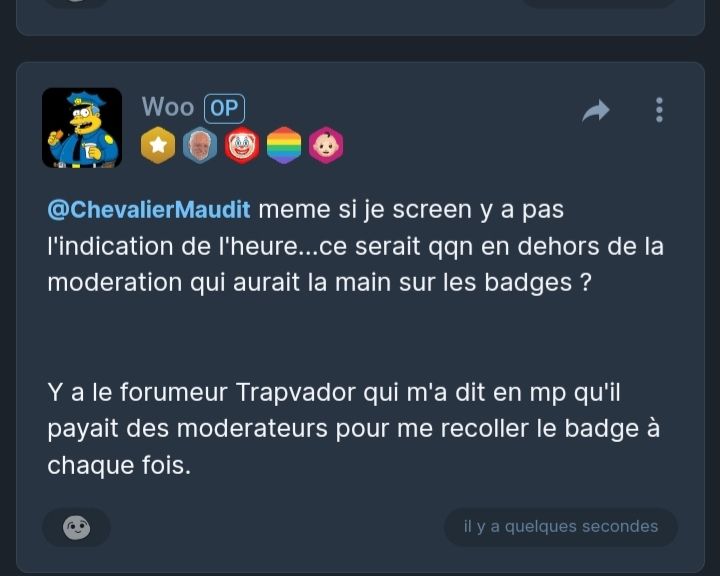 @ChevalierMaudit meme si je screen y a pas l'indication de l'heure...ce serait qqn en dehors de la moderation qui aurait la main sur les badges ?