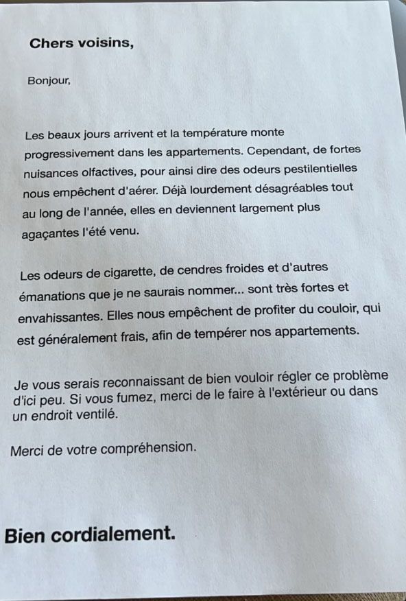 J'ai eu un mot sur ma porte ce matin. Genre ça pue la clope chez moi, et que ça se répand sur le palier. Sauf que j'habite seul et que je fume pas